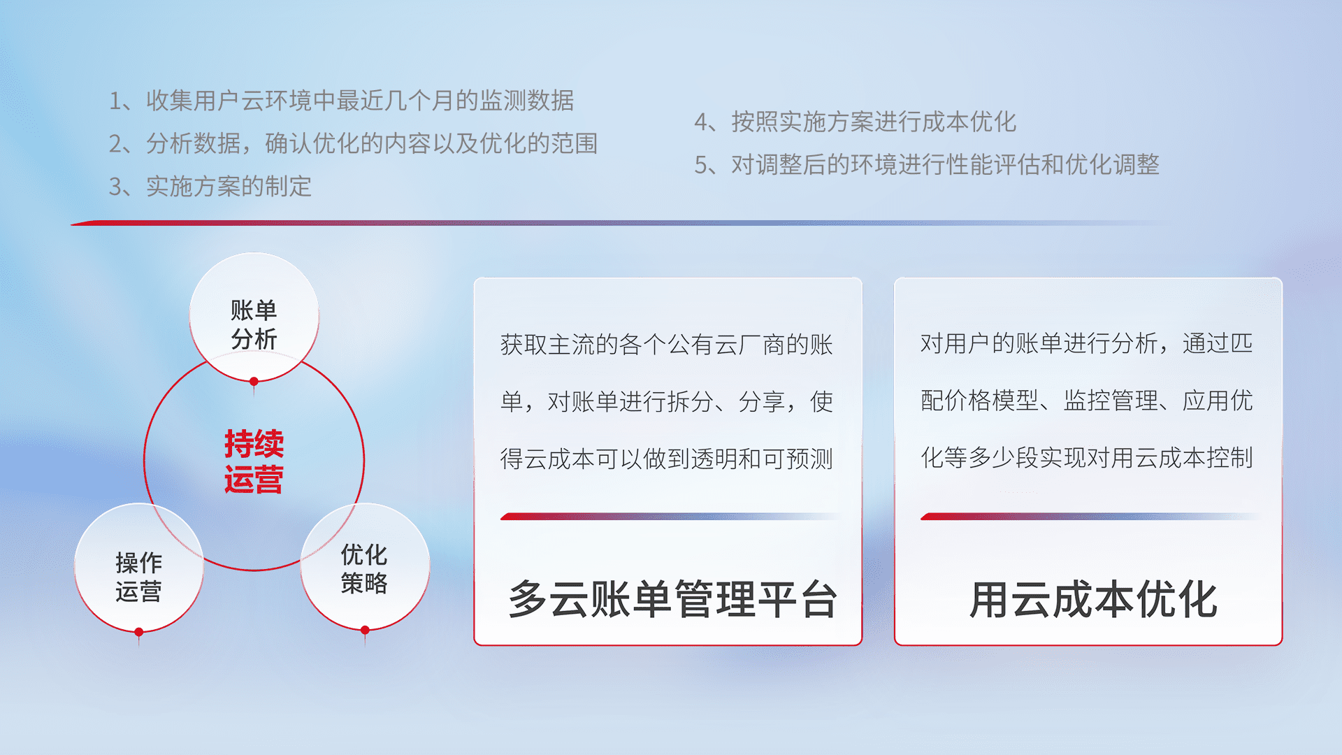 通过多云纳管,,,,以统一的资源数据模型把客户的云资源进行抽象和封装,,,,进而实现对多云资源的统一操作,,保障云资源管理的可靠性、、稳定性与可用性。。。量身定制化运维内容,,,,配置、、、开发运维、、补丁管理、、备份、、、、监控、、认证和访问管理、、、审计和日常巡检等,,,,保障在用云过程中的可靠度,,,,稳定度以及高可用率。。。