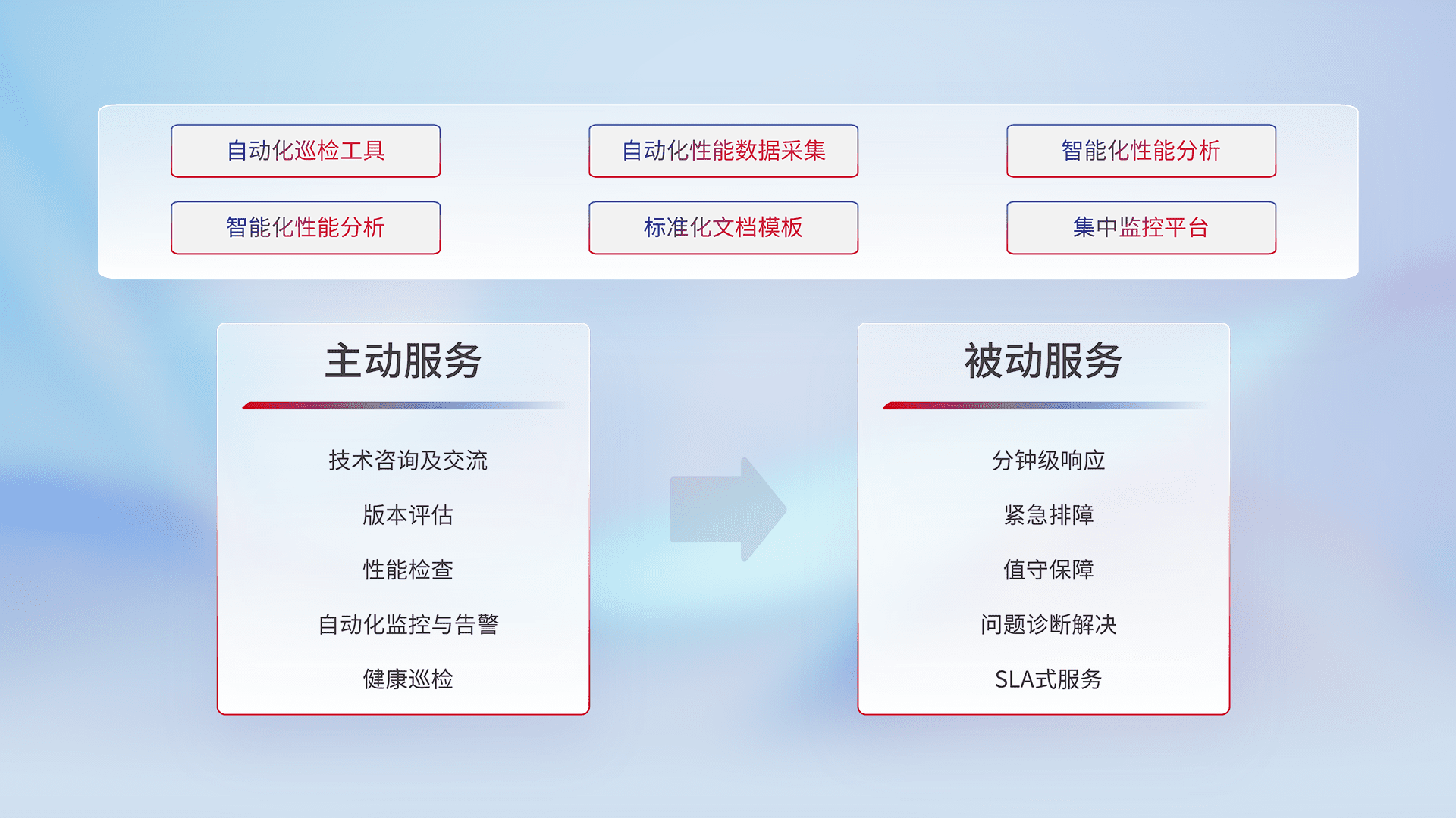 智能化工具和标准化文档,,,,保障服务质量,,,提供主动服务(包含技术咨询、、版本评估、、性能检查、、、、自动化监控与告警、、健康巡检)和被动服务包含(分钟级响应、、、紧急排障、、值守保障、、、、问题诊断解决、、、SLA服务)。。。。
